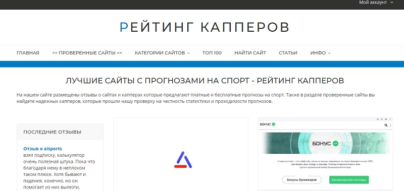 В центре стартовой страницы транслируются блоки с обзорами капперов. В левой части располагается рейтинг спортивно-аналитических ресурсов. Дальше транслируются актуальные комментарии зарегистрированных пользователей, которые комментировали услуги прогнозистов в обзорах.