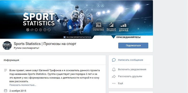Основная работа группы ведется в направлении тенниса и футбола. Есть еще рассылка на мидл рынки. Применяется рассылка букмекерской конторы Pinnacle. Кроме группы ВК Sportstatistics функционирует в Телеграмме для более удобной связи и получения прогнозов.