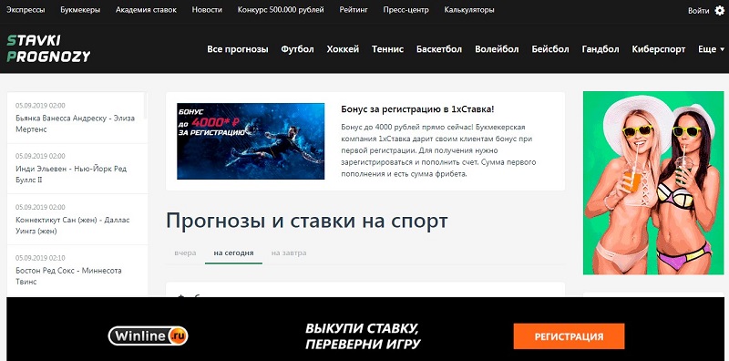 В центральной части стартовой страницы представлен список сегодняшних матчей, а сверху расположены рекламные баннеры букмекерских контор. Рейтинговая таблица конкурса прогнозистов находится с правой стороны, где также присутствует рейтинговый список лучших букмекерских контор.