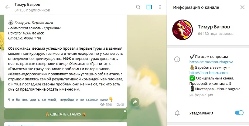 Единственный плюс заключается в том, что Тимур не принуждает никого ставить по его прогнозам. На тематические сайтах отзывов об этом телеграм-канале найти не удалось. Багров специализируется на рекламе сомнительных проектов и букмекерских контор. Если кто-то из игроков подпишется к его рефералке, то вообще будет здорово. Просмотры и большинство подписчиков в его телеграм-канале накручены.