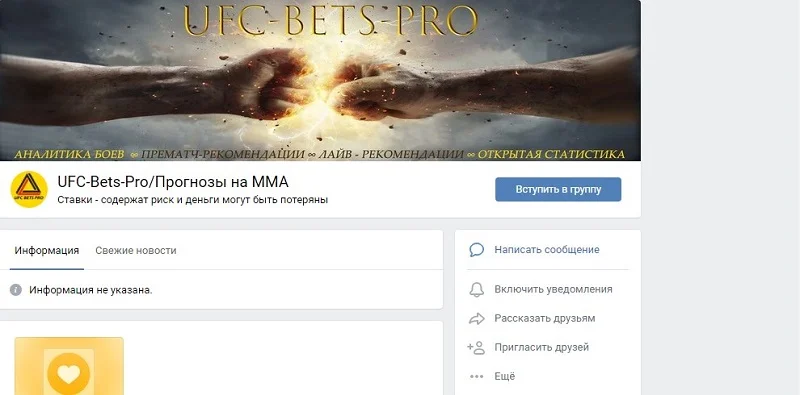 Лента группы ежедневно снабжается новостями из мира MMA и UFC. Анонсы платных ставок и бесплатные прогнозы публикуются в отдельных ветках. Отметим, что для бесплатных ставок каппер практикует прогнозы для матчей, которые проходят в режиме Live.