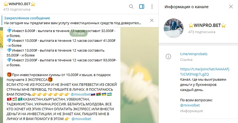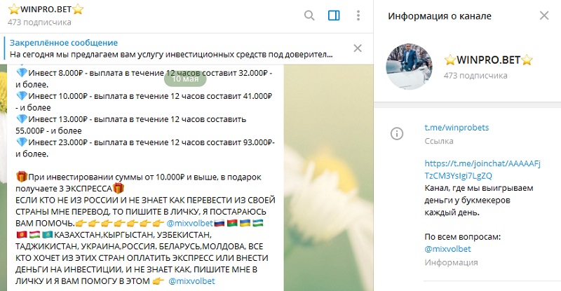 Мошеннический проект WINPRO.BET, а его можно смело таковым считать, работает по накатанной схеме. Главная задача админа группы – привлечь внимание начинающего беттора, который думает, что в спортивных ставках можно добиться стремительного заработка.