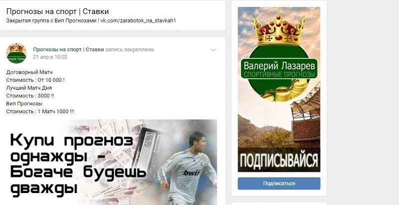 Почитав описание основного паблика Лазарева, его сразу можно уличить в мошенничестве. Сергей рекламирует матчи договорного характера, информация о которых к нему поступает ежедневно.