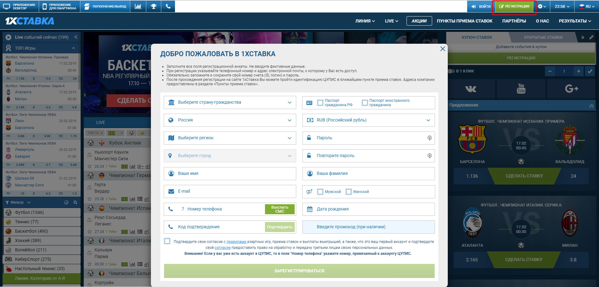 Рассмотрим пример регистрации нового участника пари в популярной букмекерской конторе «1хСтавка». Перейдя на официальный сайт, находим в правом верхнем углу меню «Регистрация».