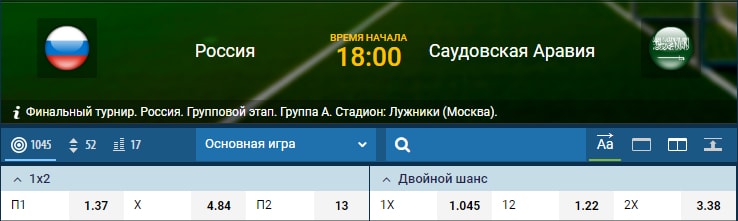 Для того, чтобы понять, как оценивает вероятность прохода того или иного коэффициеннта букмекер, можно воспользоваться формулой - 100: коэффициент. Для примера возьмем стартовый матч Чемпионата Мира 2018 года между сборными России и Саудовской Аравии: