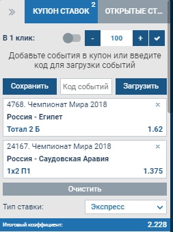 Пример возврата по одному из событий в экспрессе: представим, что игрок размещает экспресс из двух событий на два матча российской сборной на групповом этапе Чемпионата Мира - в матче с Саудовской Аравией он ставит на победу сборной России, а в матче со сборной Египта размещает ставку на общий тотал больше двух голов: