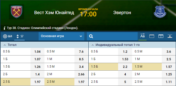 - Для успешного использования стратегии необходимо найти два матча с одинаковыми коэффициентами на тотал, они должны находиться в районе 1.95-1.98. Важно, чтобы и коэффициент на обратный исход был точно таким же. Возьмем для примера поединок 38 тура английской Премьер-Лиги между «Вест Хэмом» и «Эвертоном. Как видим из скриншота, коэффициент на исход ТБ (2.5) равен 1.97, и точно такой же коэффициент букмекер предлагает на исход ТМ (2.5).