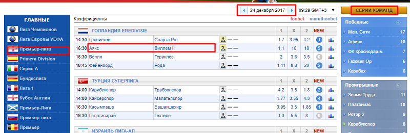Внутри, допустим, футбола есть возможность работы с информацией в разрезе турнира или отдельного матча. С помощью кнопок навигации можно перемещаться во времени. Помимо этого, вы можете узнать о самых длинных победных, ничейных и прочих сериях.
