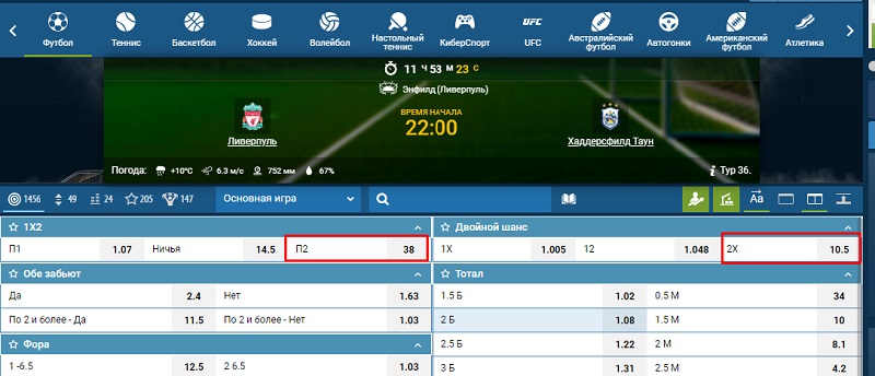 Рассмотрим матч Лиги Чемпионов, в котором «Манчестер Юнайтед» сыграет с «Барселоной». На победу хозяев БК предлагает коэффициент 3.30, выигрыш гостей котируется отметкой 2.20. В данном случае изначальное преимущество «Барселоны» не столь существенное, значит «Манчестер Юнайтед» идет скрытым андердогом в матче.