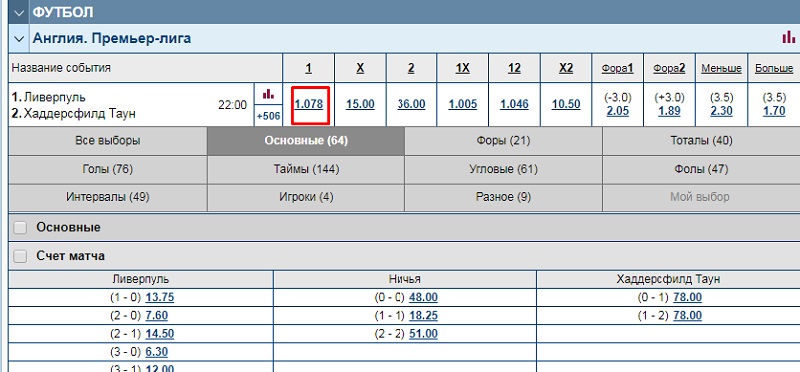 Предположим, что клиент букмекерской конторы решил сделать ставку на точный счет в футбольном матче «Арсенал» - «Челси», но его БК не разрешает ставить на данный исход ординаром или урезала лимит по ставке. В таком случае, беттор попытается отыскать ставку с высокой вероятностью проходимости, коэффициент которой не будет превышать 1.15.