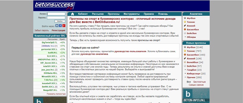 Игровой аудитории из России и других стран СНГ наверняка известен сайт betonsuccess.ru. Этот проект выполняет две основных функции – верифицирует прогнозы на спорт от аналитиков и дает возможность их авторам продавать их.