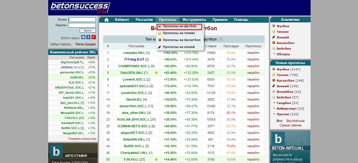 Левая боковая панель сайта оснащена рейтингом прогнозистов. Всего на сервисе предусмотрено три специальных рейтинга аналитиков – краткосрочный, комплексный и комплексный BIG. Над рейтинговыми таблицами расположена форма для авторизации и регистрации на сайте.