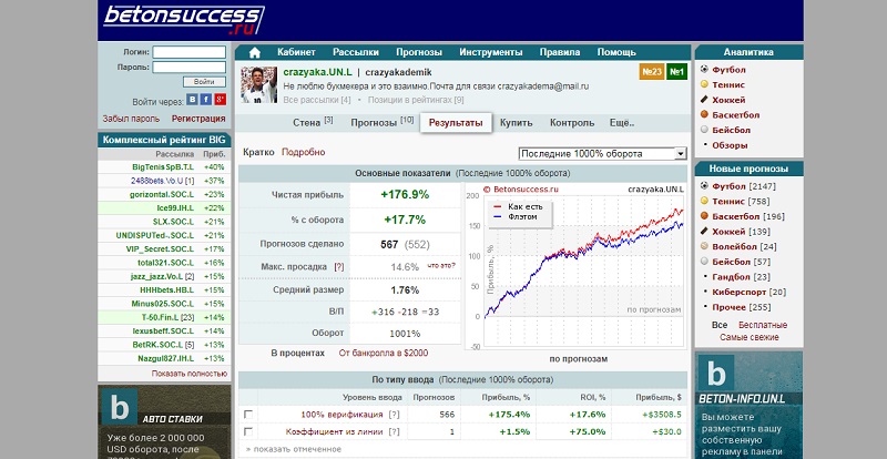 Подробная статистика каждого аналитика доступна в его профильной карте. Открыть ее можно путем клика по имени прогнозиста. В данном меню будут представлены показатели чистой прибыли аналитика, процент с оборота, количество сделанных прогнозов, показатели в разрезе видов спорта, по месяцам, по коэффициентам и т.д.