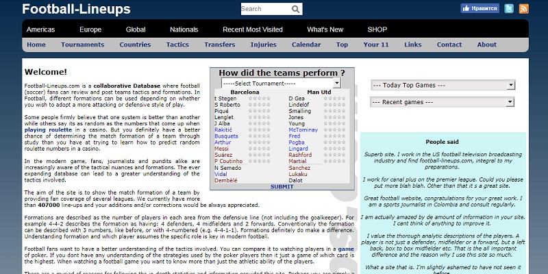 Дизайн сайта football-lineups.com построен в устаревшем стиле, но это лишь улучшает восприятие публикуемой информации, а также обеспечивает быструю загрузку страниц. Страницы на белом фоне окружает голубой основной фон, а верхняя панельное меню оснащено основными разделами ресурса.