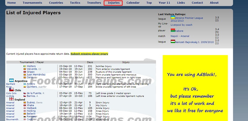 - Injuries. В этом разделе игроки могут узнать последние новости о травмированных игрока. Все повреждения футболистов занесены в отдельную таблицу, где указаны имя игрока, дата травмы, ориентировочный период восстановления и характер повреждения.
