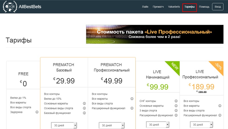 - Live профессиональный – 189.99 евро за месяц. Все букмекерские конторы, все типы ставок и видов спорта, расширенный функционал.
