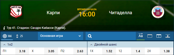 Суть данной стратегии заключается в страховке основной ставки. Для начала, необходимо выбрать такой исход, в котором букмекер предполагает высокую вероятность ничьей. Мы в данном случае выбираем поединок Серии Б между «Карпи» и «Читаделлой». В указанном турнире 35% матчей заканчиваются ничьими, а это очень высокий показатель. Для примера, в той же Серии А процент ничьих оставляет 22% в сезоне 2017-18, в английской Премьер-Лиге 25%, в испанской Примере – 23%. Разница, как мы можем заметить, довольно существенная, поэтому такой турнир для нашей стратегии подойдет по всем параметрам. Итак, последовательность действий: