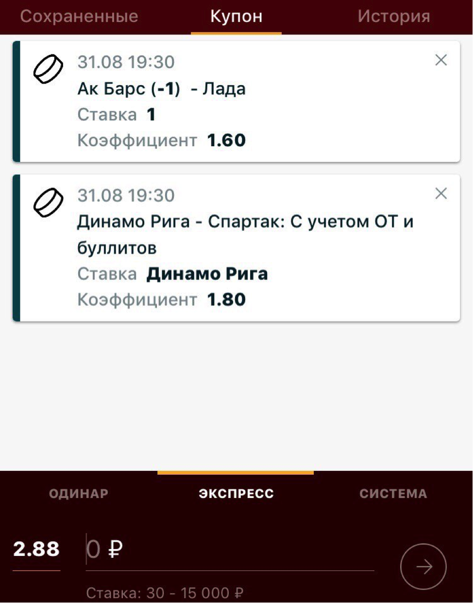 Добавляем в купон нужные нам ставки: "Ак Барс" (-1) за 1,60 и победа "Динамо" Рига в матче за 1,80. Выбираем тип ставки "экспресс". Как видим, коэффициент на данный экспресс составляет 2,88 или 1,60*1,80. Попробуем взять еще один матч.