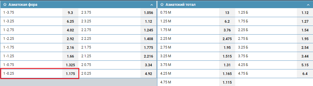 Ставка «фора 1 (-0,25)» состоит из двух исходов – Ф1(0) и Ф1(-0,5). Чтобы такой прогноз полностью сыграл, первая команда в матче должна одержать победу с любым счетом. Если встреча завершиться вничью, ставка Ф1(0) получит возврат и игрок вернет половину поставленной суммы. Второй исход в данном случае проиграет.