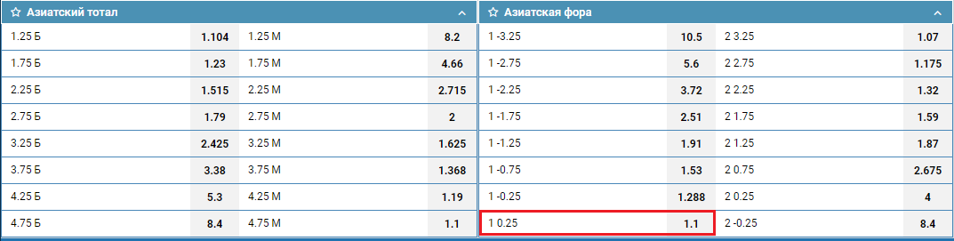 «Фора 1 (+0,25)» Ф1(+0,25)