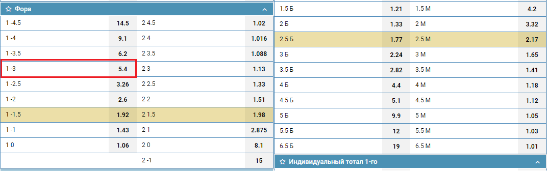 Ставка «фора 1 (-3)» сыграет в том случае, если принимающая сторона (хозяева встречи) одержат победу с разницей в четыре очка или больше. Если по итогам матча первая команда победит с разницей в три гола, такая ставка получит возврат (выплата с коэффициентом 1).