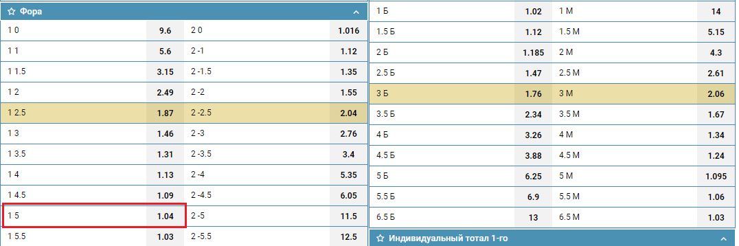 Ставка «фора 1 (+5)» сыграет в том случае, если первая команда (хозяева) выиграют матч, сыграют вничью или проиграют с разницей, не больше пяти очков (голов, шайб). Такое пари может сыграть, проиграть, или получить возврат. Последний вариант возможен в случае, если первая команда уступит с разницей ровно в пять очков.