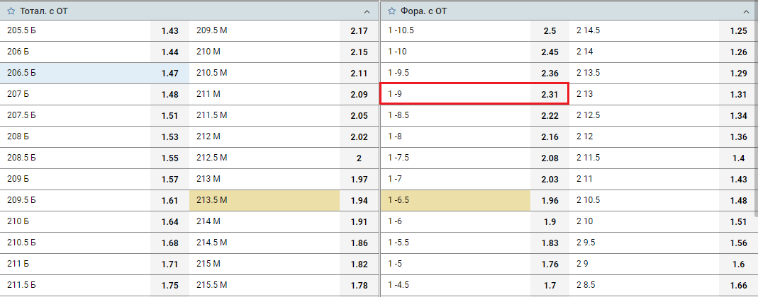 Ставка «фора 1 (-9)» сыграет, если хозяева встречи победят с разницей в десять очков или больше. Кроме выигрыша или проигрыша, такой прогноз может получить возврат. Последний вариант возможен, если первая команда выиграет с разницей ровно в девять очков.