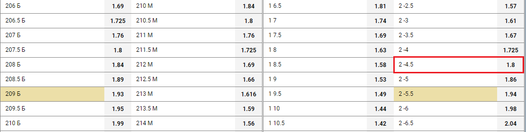 Ставка «фора 2(-4,5)» сыграет в событии, в котором победу с разницей в пять голов или больше одержала вторая команда. У этой ставки есть два варианта расчета – выигрыш или проигрыш. Показатель форы в ней заявлен с «половиной», а значит, возврат в данном случае исключен.