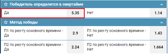 В таких ситуациях прибыль игроку может принести ставка «победа в овертайме». Заключая такое пари, клиент букмекерской конторы прогнозирует, что по истечению трех периодов, команды сыграют вничью, а победитель будет определен в дополнительном времени (овертаймах). Такая ставка сыграет в том случае, если матч завершится именно в дополнительное время. Если победитель будет определен в серии буллитов, ставка проиграет. При этом, игроку не важно, какая из команд выиграет матч.