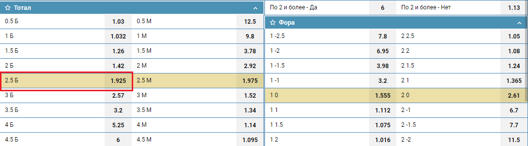 Ставка типа «тотал (2,5) больше» является базовой для футбольных матчей. Именно такой показатель тотала чаще всего встречается в основных росписях БК. Заключая данное пари, игрок прогнозирует, что в поединке, команды на двоих забьют минимум три гола. Рациональней всего такую ставку размещать на события, в которых встречаются две атакующих команды, или чемпионат, в котором он проходит, отличается высокой результативностью.