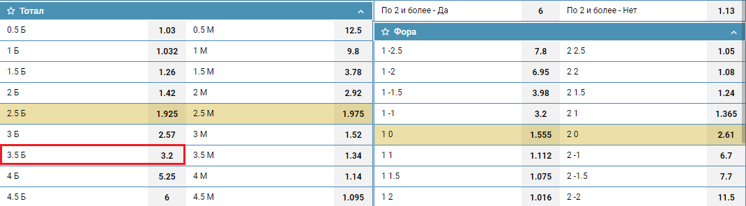 Сделав ставку «тотал (3,5) больше», игроку необходимо, чтобы в выбранном им поединке было забито минимум четыре гола. Такие пари имеют два варианта расчета – положительный (выигрыш) или отрицательный (проигрыш). Лучше всего такую ставку размещать на поединок, в котором встречаются фаворит и аутсайдер, или же участники матча проповедуют атакующий стиль игры, регулярно отмечаясь несколькими забитыми голами.