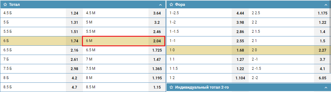 Тип ставки «тотал (6) меньше» в большинстве своих случаев уместен для хоккейных рынков, реже футбольных. Сделав такой выбор, игрок спрогнозировал, что участники встречи в суммарном количестве забьют не больше шести голов (забросят шайб). Такой вид пари может быть рассчитан букмекером с коэффициентом 1 (возврат). Такой вариант возможен, если в общей сложности команды совершат ровно шесть результативных действий.