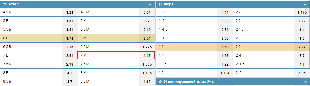 Пример: 16 марта в НХЛ встречались Анахайм и Флорида. На это событие игрок сделал ставку ТМ (7), а сам поединок завершился победой хозяев со счетом 3:2. Суммарно команда забросили пять шайб – ставка сыграла.