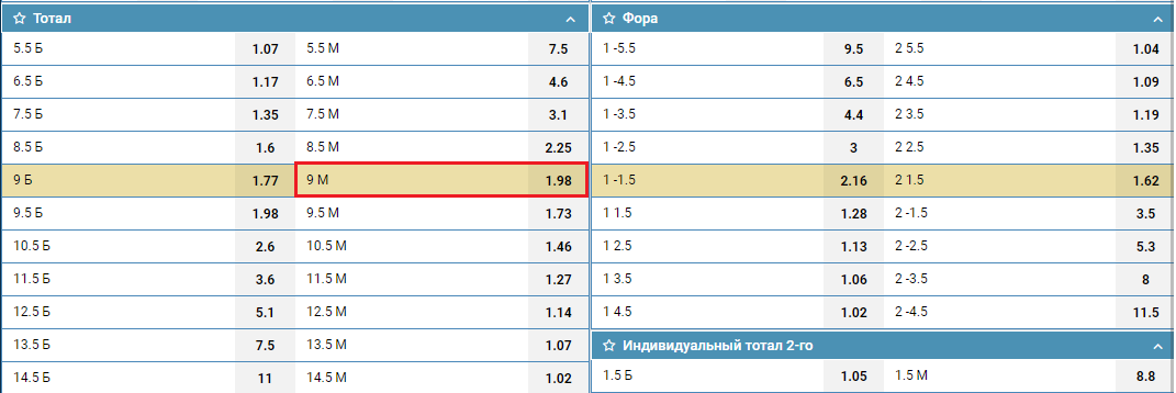 Тип ставки «тотал (9) меньше» будет уместен для хоккейных рынков. Сделав данный выбор, игрок спрогнозировал, что в выбранном им матче, его участники суммарно забьют не больше девяти голов (забросят шайб, наберут очков). Кроме выигрыша или проигрыша, такая ставка может получить возврат (коэффициент 1). Такой вариант возможен лишь в том случае, если суммарно во встрече команды забьют ровно девять голов.
