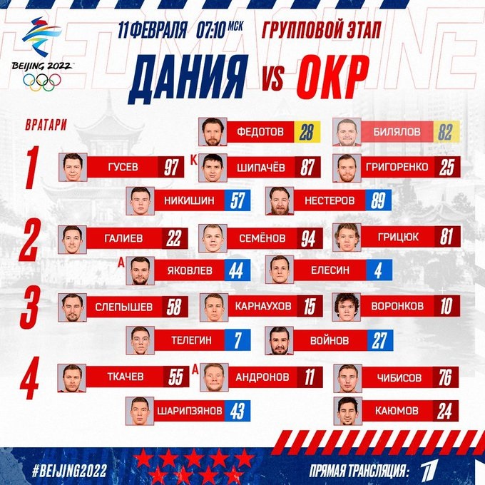 Официальный твиттер Федерации хоккея России объявил состав российской сборной на матч против сборной Дании в рамках второго тура группового этапа на Олимпийских играх в Пекине.