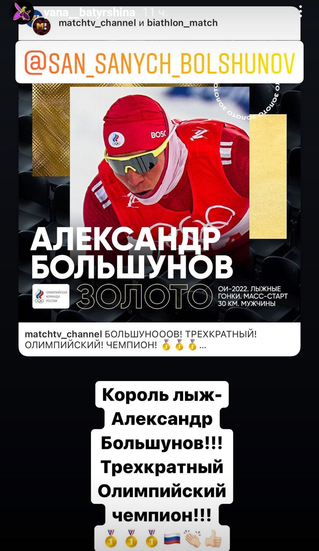 "Король лыж - Александр Большунов!!! Трехкратный олимпийский чемпион!!!" - написала Батыршина в сторис инстаграма.