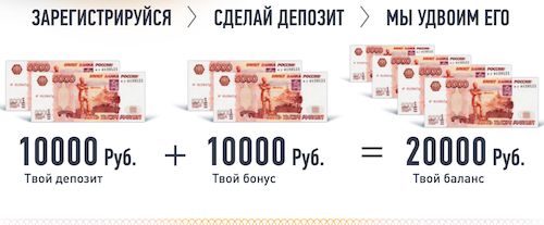 • Сумма бонуса равна сумме первого депозита, но не более 10 000 рублей