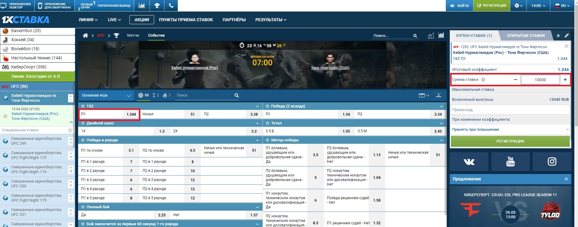 Так и выглядит размещение ставки на бой между Хабибом Нурмагомедовым и Тони Фергюсоном, надеемся, что наша инструкция помогла разобраться со всеми тонкостями процесса.