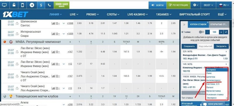 1хСтавка, Лига Ставок, Winline, PariMatch и другие букмекеры предлагают пользователям поставить на экспресс. Суть такого пари заключается в том, чтобы собрать купон из 2 или более несвязанных событий. Коэффициенты исходов перемножаются, в результате чего пользователь может рассчитывать на большую прибыль.