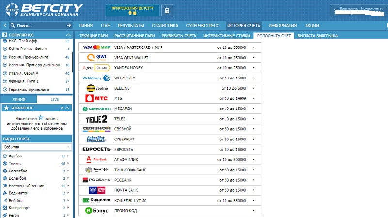 Для заключения интерактивных пари, после создания аккаунта и прохождения идентификации, нам осталось внести депозит. В этой статье мы разберем, как пополнить в Бетсити, разобрав разные способы и ознакомившись с тарифами БК.