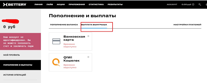 Главная особенность Беттери – тесное сотрудничество с Qiwi, поэтому игроки могут положить средства на счет только в рублях. Чтобы оплатить счет и снять деньги, необходимо пройти идентификацию. Процесс отличается в зависимости от гражданства беттора. Баланс пополняется моментально. Минимальный депозит составляет 100 рублей, а сумма максимального лимита составляет 500 тыс. рублей.