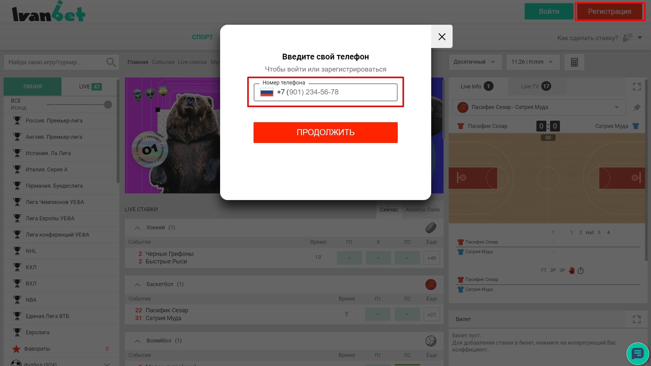 Перед тем, как начинать делать ставки необходимо зарегистрироваться в системе Ivanbet. Если доступ к сайту ограничен, то нужно использовать зеркало. После перехода на ресурс конторы нужно нажать на кнопку «Регистрация», которая расположена в верхней части интерфейса. В специальном поле вводится рабочий номер телефона. Позже на него будет отправлено сообщение с проверочным кодом. В конце следует указать адрес электронной почты, подтвердить возраст, зайти в личный кабинет.