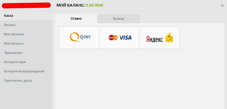 После авторизации зайдите в личный кабинет и откройте раздел «Касса». В нем нужно стать на вкладке «Ставка», где будут представлены доступные варианты оплаты. На сегодняшний день можно использовать один из трех способов пополнения: