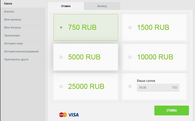 Чтобы внести депозит с использованием банковской карты, выберите соответствующий вариант. В появившемся окне можно выбрать одну из сумм пополнения (750, 1500, 5000, 10 000 или 25 000 рублей), или же указать ее вручную – поле «Ваша сумма».