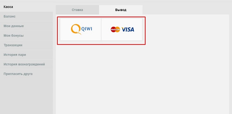 Затем посетите раздела «Касса» и в нем откройте вкладку «Вывод», в которой представлены доступные варианты для списания денежных средств. На сегодняшний день выводить деньги с GG BET можно на карту банка и электронный кошелек QIWI.