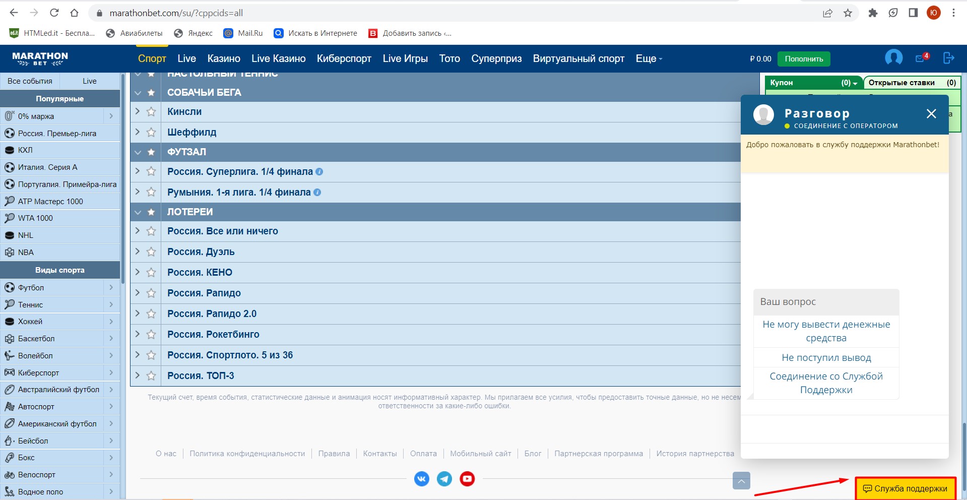 Еще одним популярным вариантом помощи является онлайн-чат. Кнопка его вызова находится в правом нижнем углу на любой открытой странице БК Марафон. Такая связь наиболее оперативна и применяется, когда пользователю нужно получить быстрый и короткий ответ на свой вопрос: где посмотреть актуальные акции, как пополнить счет определенным способом, почему долго не поступают деньги на баланс и так далее.