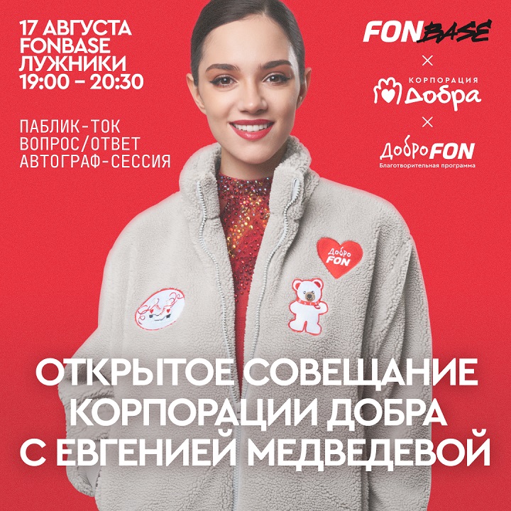 В ходе открытого Public talk, который пройдет на городском пространстве Fonbase, любой желающий сможет задать вопрос Медведевой и узнать подробнее о важности благотворительности в спорте. Помимо этого, гости мероприятия смогут эксклюзивно увидеть премьеру четвертой серии скетч-сериала «Корпорация Добра» с Медведевой и Буруновым в главных ролях.