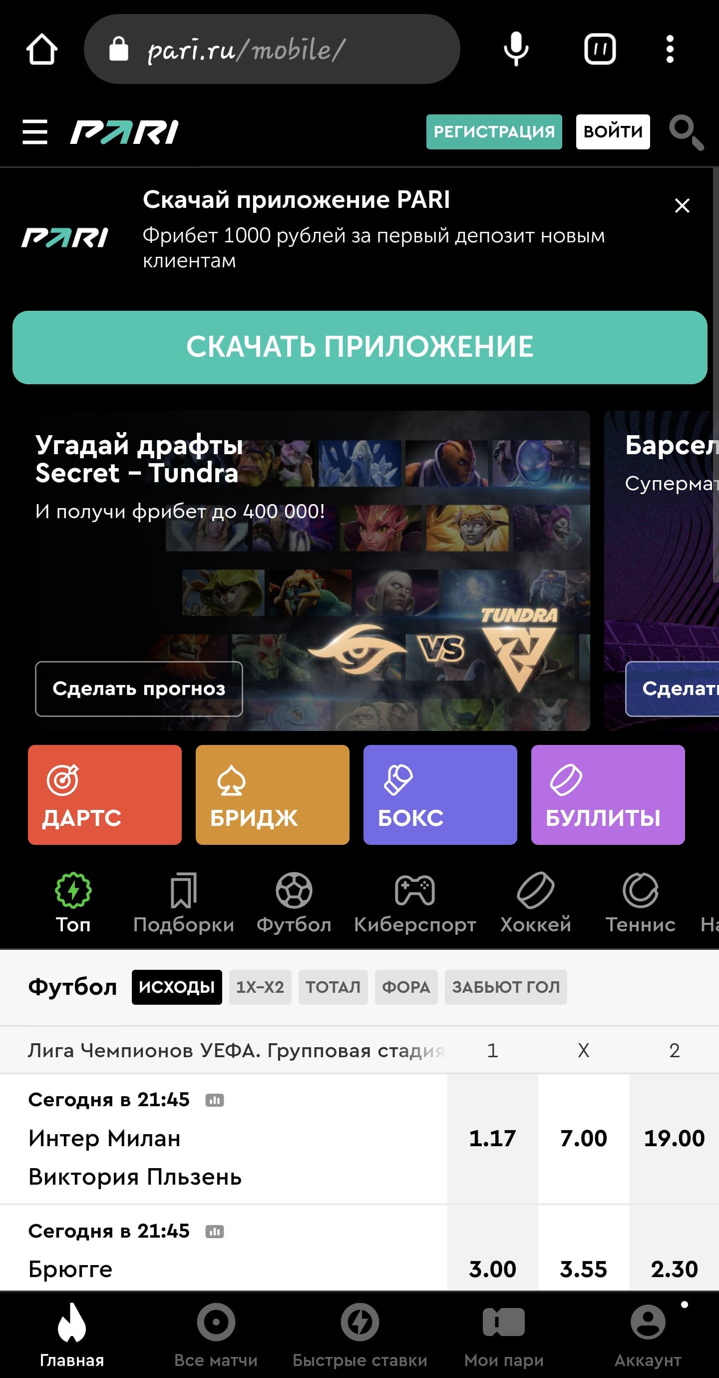 2. Графика - простая и понятная страница мобильной версии, а также минимизированное и удобное меню приложения, позволят научиться совершать ставки с телефона. Процесс будет проходить быстрее у тех, кто до этого был клиентом нелегального БК PARI.