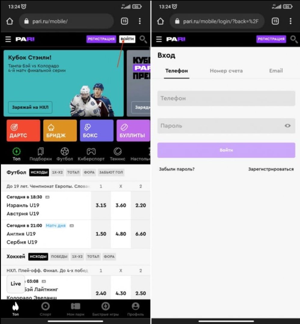 Для получения доступа к полному набору инструментов для беттинга, на облегченной версии портала Pari нужно осуществить вход в личный кабинет. Для этого применяются логин и пароль, которые, используются на полноценном ресурсе.