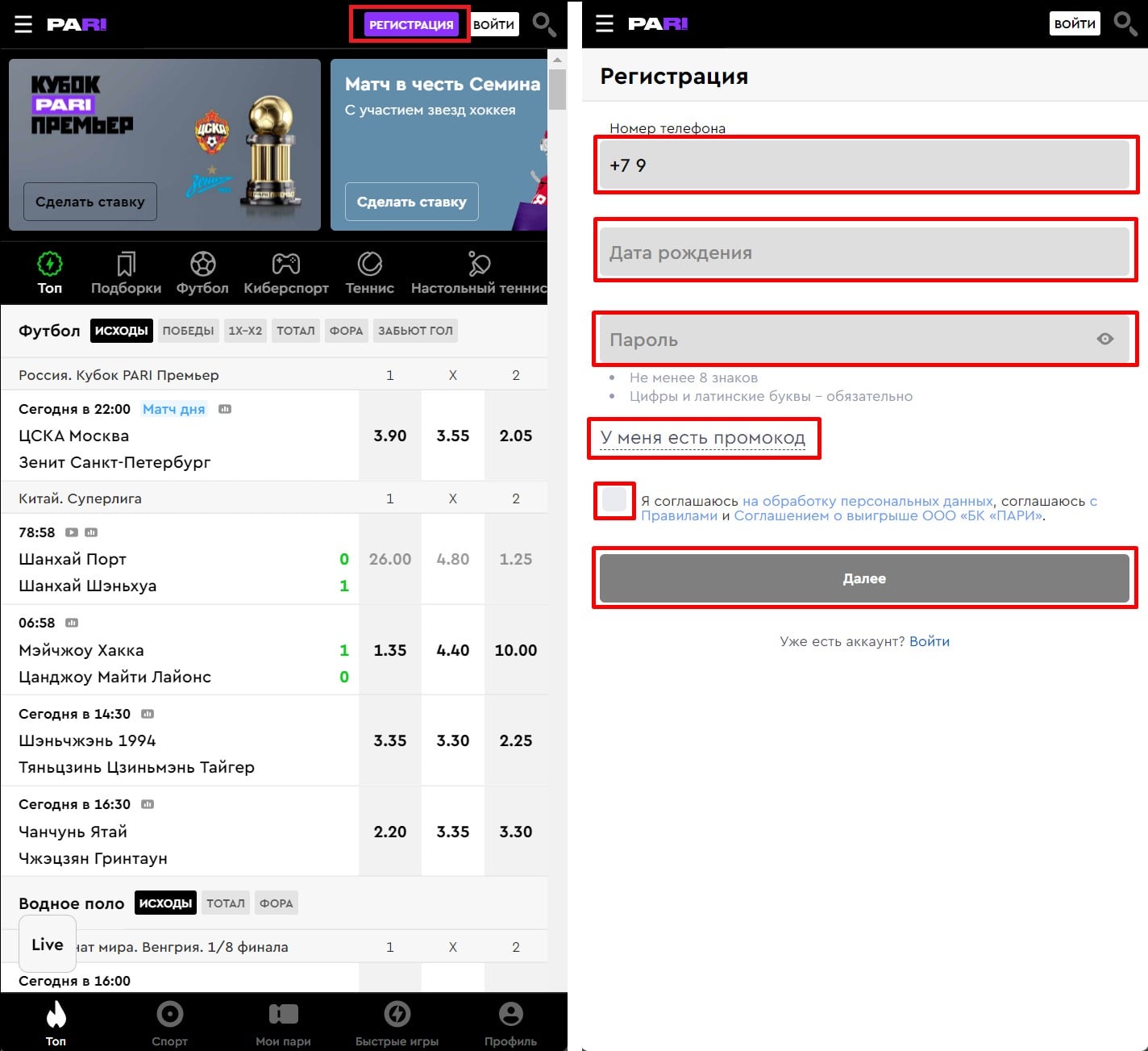 Регистрация и идентификация в БК PARI ru